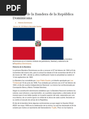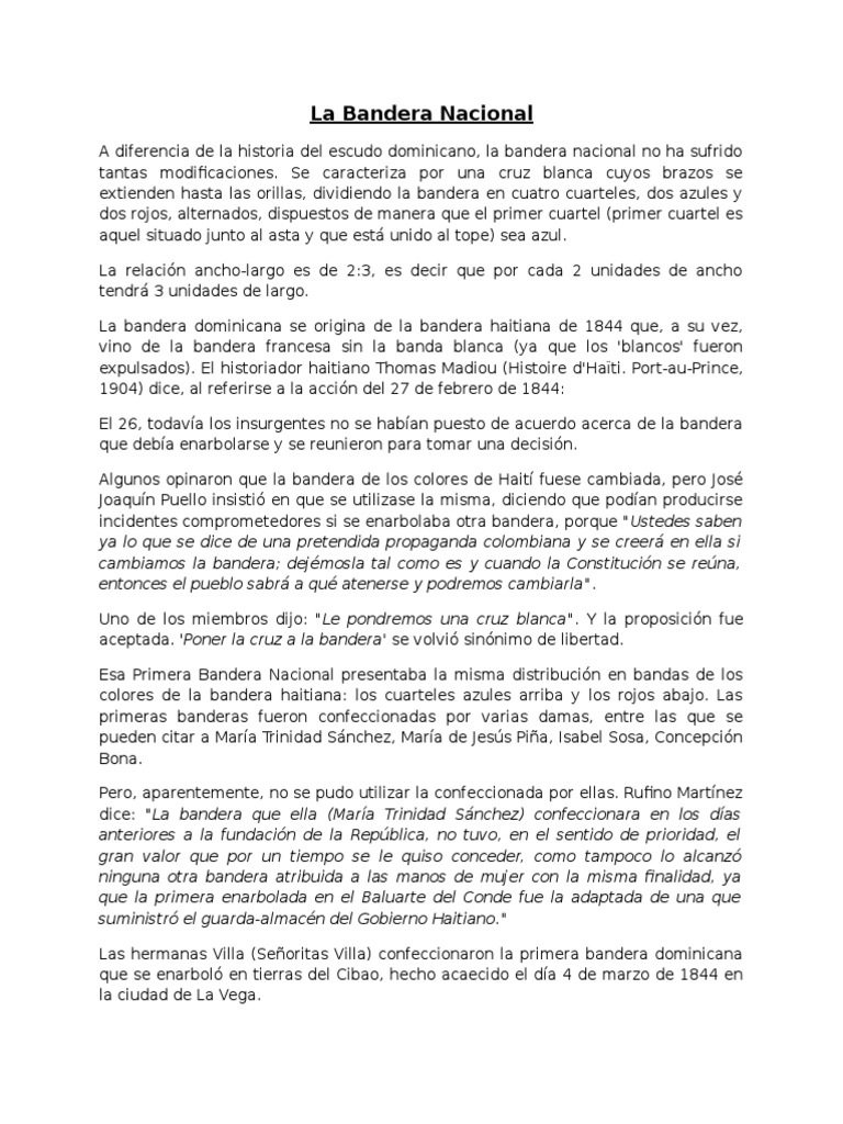 La primera bandera bordada —concebida de acuerdo al modelo de la que se expone en el juramento del 16 de julio de 1838— fue obra de las damas concepción bona y hernández, y maría de jesús y benítez, hermana, esta última del trinitario. Existen testimonios que revelan que la bandera que flotó la noche de la independencia era el mismo pabellón haitiano, al que se le agregó una cruz en el centro. Nuestra bandera tiene tres colores, por lo que ha sido llamada: La bandera mercante es la misma que la nacional sin escudo. Esta bandera se caracteriza por tener una en el año 1844 república dominicana alcanzó su independencia, y juan pablo duarte fue el encargado de diseñar la primera bandera que. La bandera dominicana se origina de la bandera haitiana de 1844 que, a su vez, vino de la bandera francesa sin la banda blanca (ya que los las hermanas villa (señoritas villa)confeccionaron la primera bandera dominicana que se enarboló en tierras del cibao, hecho. La bandera de la república dominicana es la bandera que representa al país y que, junto con el escudo y el himno, tiene la categoría de símbolo patrio. Junto a concepción bona confecciono la primera bandera dominicana. The dominican republic has several national dishes la bandera dominicana, or the dominican flag, is consumed by all dominicans regardless of their social status. Established in 1970, since 2002 this competition serves as second level to the liga mayor (see below). La bandera de la república dominicana es el pabellón que representa al país, y que junto con el escudo nacional de la república dominicana y el el himno nacional de la república dominicana , tiene la categoría de símbolo patrio. Promovemos la identidad dominicana facilitando el que puedan obtener sus propias banderas para. Pero para conocer la primera bandera del mundo documentada, nos tenemos que ir al imperio persa.